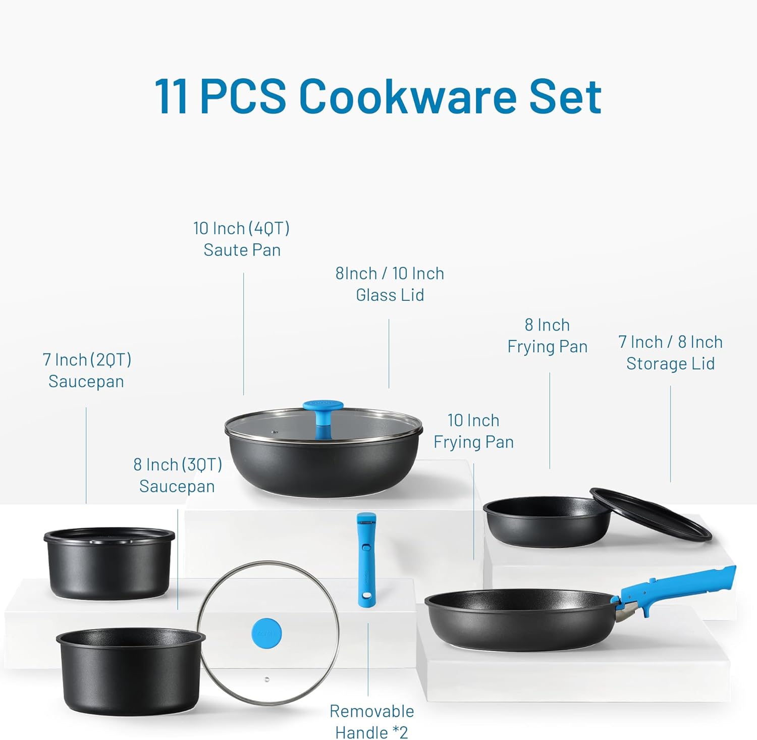 - Complete Cookware Set: Includes fry pans, saucepans, sauté pans, silicone lids, storage lids, and two removable handles to fit every piece.