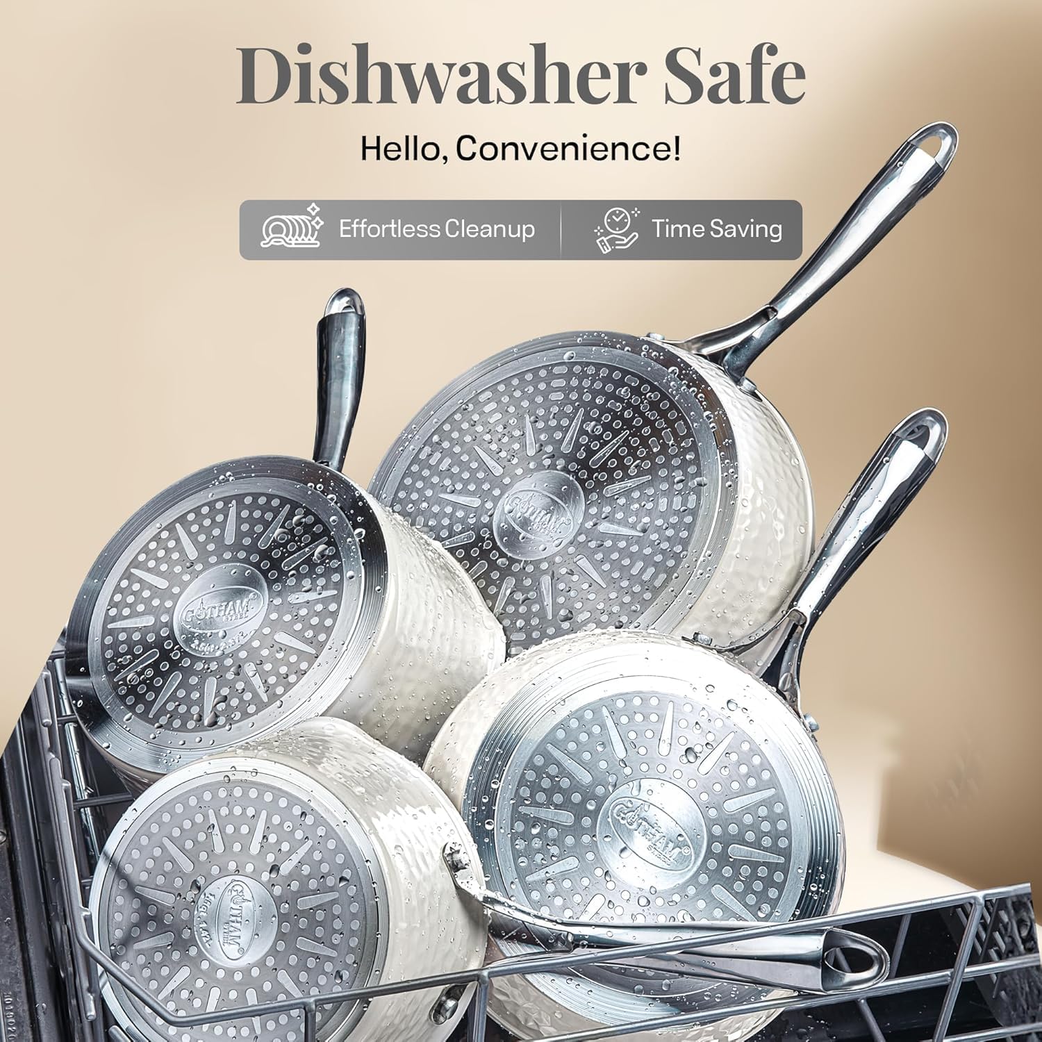 Built for serious performance and easy everyday use, the Gotham Steel Hammered Frying Pan Set combines smart design with lasting durability. Each pan features a triple-coated ceramic nonstick surface reinforced with diamond particles, offering smooth food release with little to no oil. Stamped from solid aluminum, the pans heat evenly and consistently without hotspots. They're oven safe up to 500°F (with lids) and work on gas, electric, and glass stovetops. The ergonomic stainless steel handles are designed to stay cool while cooking and offer a comfortable, secure grip. Dishwasher safe and free from harmful chemicals like PFOA, PFOS, lead, and cadmium, this set is made for healthy cooking with zero compromise on performance.