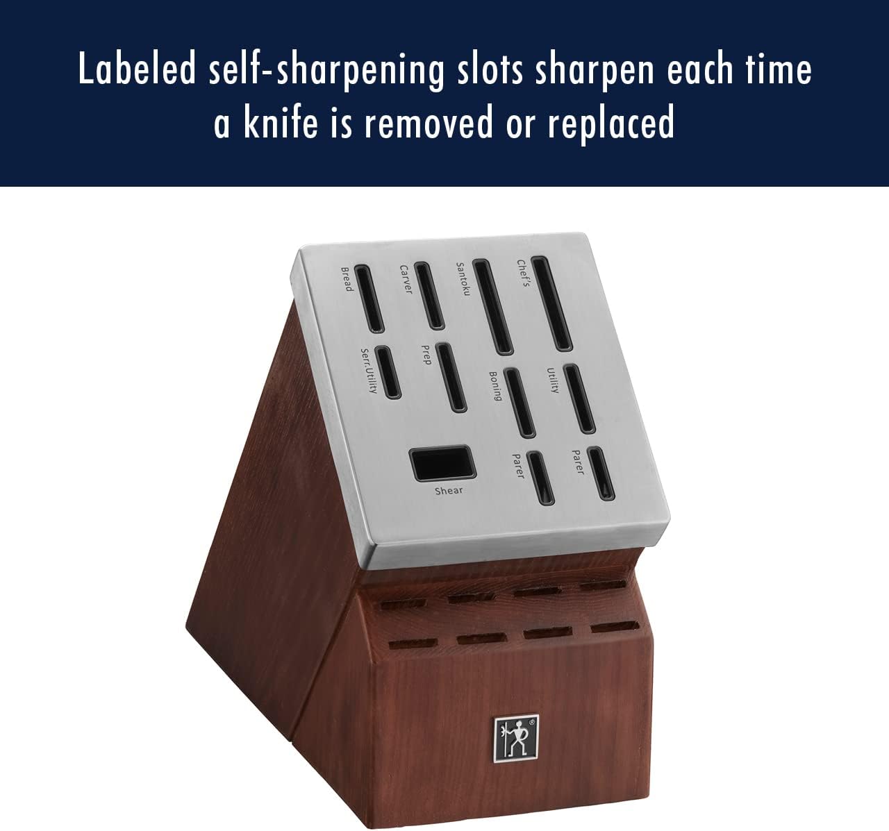 The Henckels International Self-Sharpening Graphite Knife Block Set keeps every blade razor-sharp and ready to use. Built-in ceramic honing wheels automatically sharpen knives each time they are removed or replaced, so effortless precision is always within reach. Serrated knife slots keep their edges intact, ensuring long-lasting performance. Each knife is crafted from high-quality German stainless steel with a fully forged construction that delivers strength, balance, and durability. The seamless transition from blade to handle adds control, while the ergonomic triple-rivet handles provide comfort for extended use. The self-sharpening block features a stained ash wood base with a brushed stainless steel cap, combining modern design with everyday function. Tailor-made for the Henckels Graphite series, this set blends professional performance with countertop-worthy style.