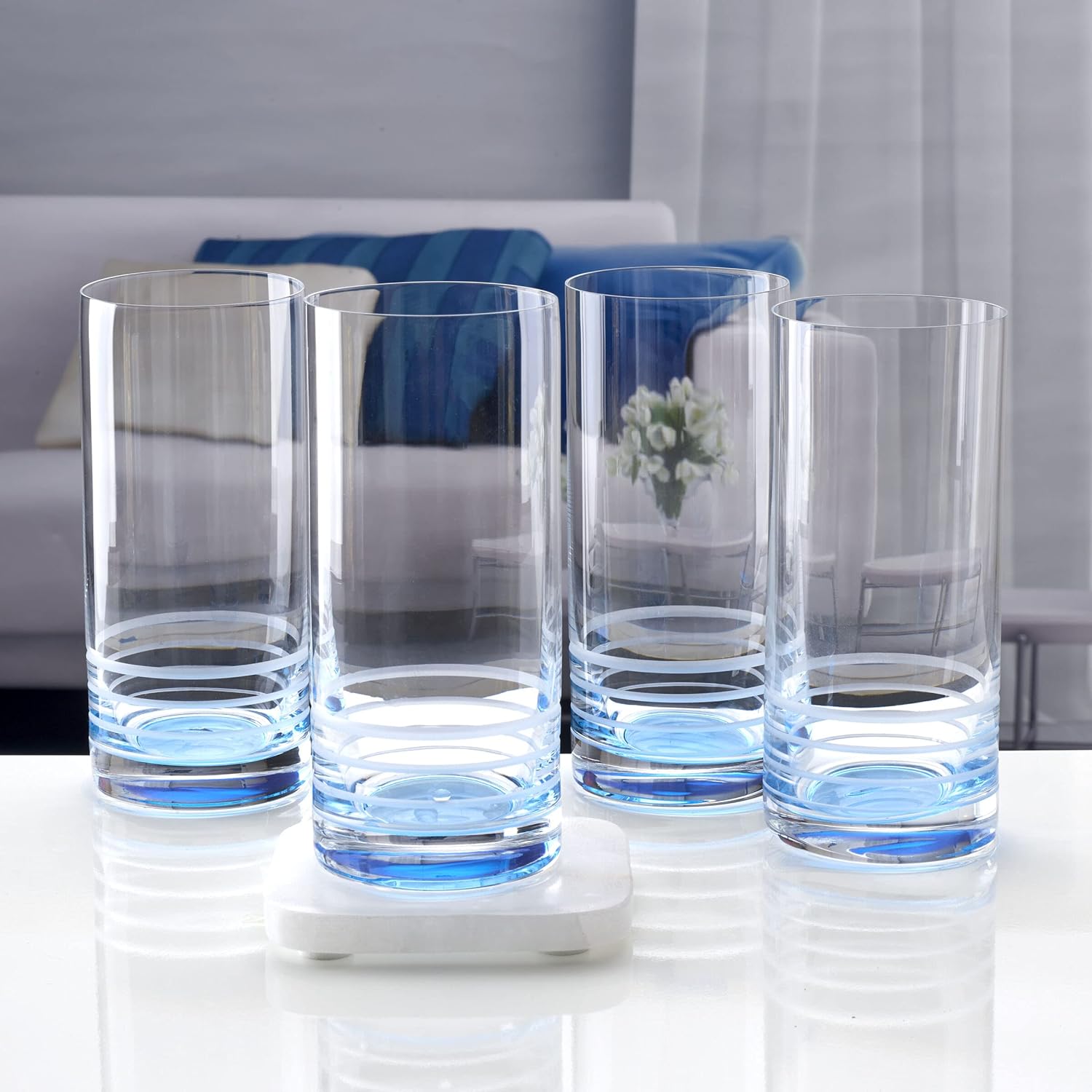 Elevate your drinkware collection with the modern elegance of the Mikasa Cal Ombre Highball Glasses. Featuring a striking ombre blue gradient that begins at the base and fades upward into finely cut horizontal lines, these glasses offer a stylish and refreshing touch to any occasion. Whether you’re serving cocktails, mocktails, or your favorite iced beverages, this set is designed to impress.