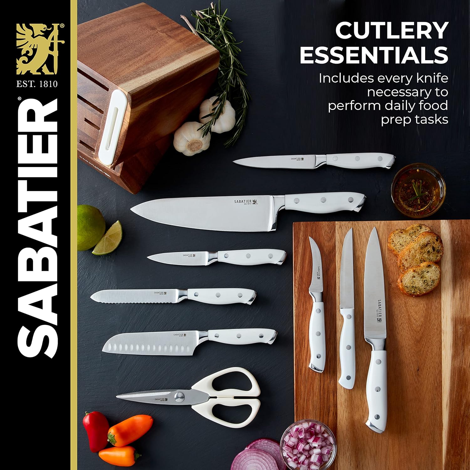 The Sabatier 15-Piece Forged White Triple Rivet Knife Block Set is the perfect blend of innovation, performance, and style. Designed with a built-in universal EdgeKeeper sharpener, this patented technology makes it easy to maintain razor-sharp blades right from your countertop. Simply insert your knife into the slot and glide it through the ceramic rods for quick and efficient sharpening — no separate tools needed.