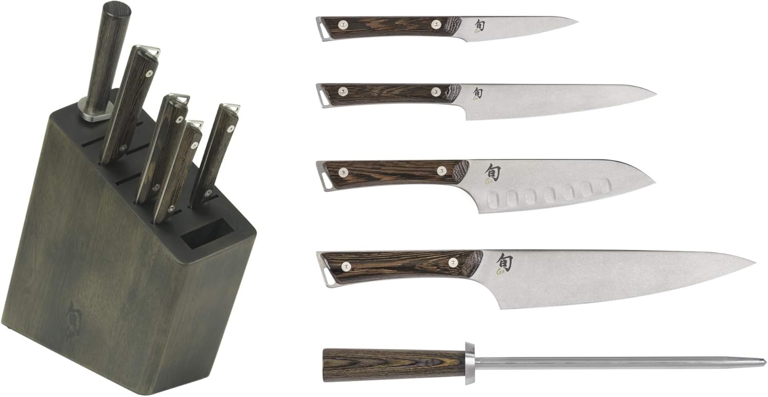 - Comprehensive 6-Piece Set: Includes an 8" chef’s knife, 6" utility knife, 5.5" hollow-ground santoku, 3.5" paring knife, honing steel, and solid wood block.